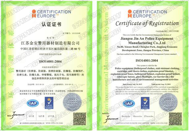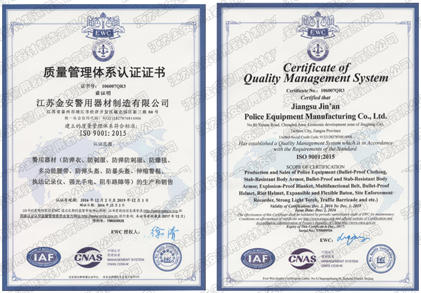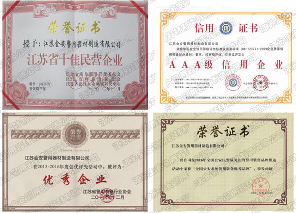 第一批新型單警裝備定點(diǎn)生產(chǎn)企業(yè) 公安部警用裝備采購(gòu)中心協(xié)議供貨單位 公安部防彈防刺服生產(chǎn)定點(diǎn)企業(yè) 江蘇省公安廳防彈衣入圍企業(yè) 江蘇警用裝備行業(yè)協(xié)會(huì)會(huì)員單位 中國(guó)刑事科學(xué)技術(shù)協(xié)會(huì)團(tuán)隊(duì)會(huì)員單位 中國(guó)安全防范產(chǎn)品行業(yè)協(xié)會(huì)會(huì)員單位 靖江市保安器材行業(yè)協(xié)會(huì)常務(wù)理事單位 全國(guó)警用裝備標(biāo)準(zhǔn)化技術(shù)委員會(huì)通訊委員 江蘇金安警用器材制造有限公司始創(chuàng)于九十年代初,公安部防彈防刺服生產(chǎn)定點(diǎn)企業(yè)、公安部警用裝備采購(gòu)中心2..